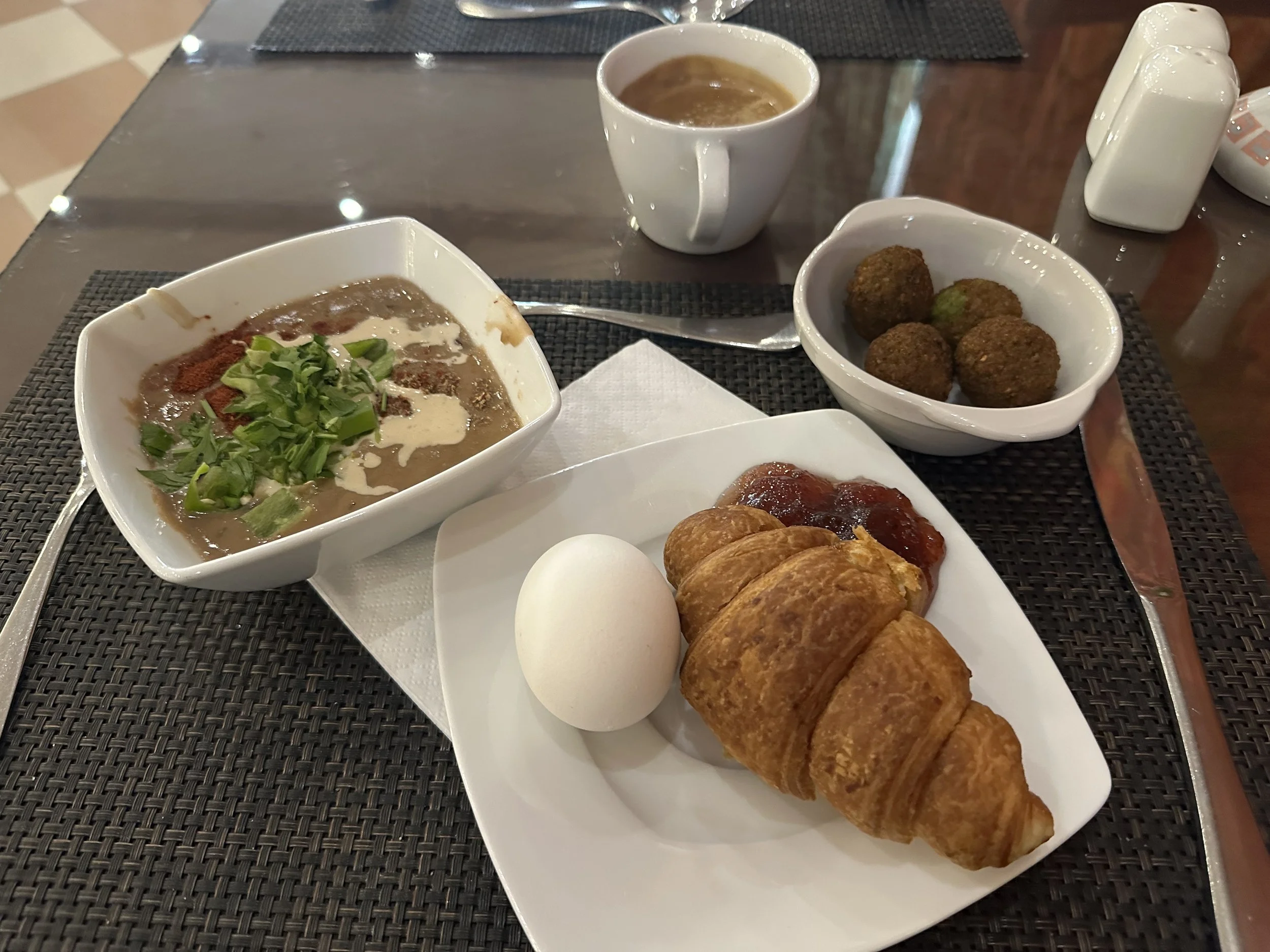 Besides the croissant, this is a classic Egyptian breakfast: fuul, falafel, and a hard-boiled egg
