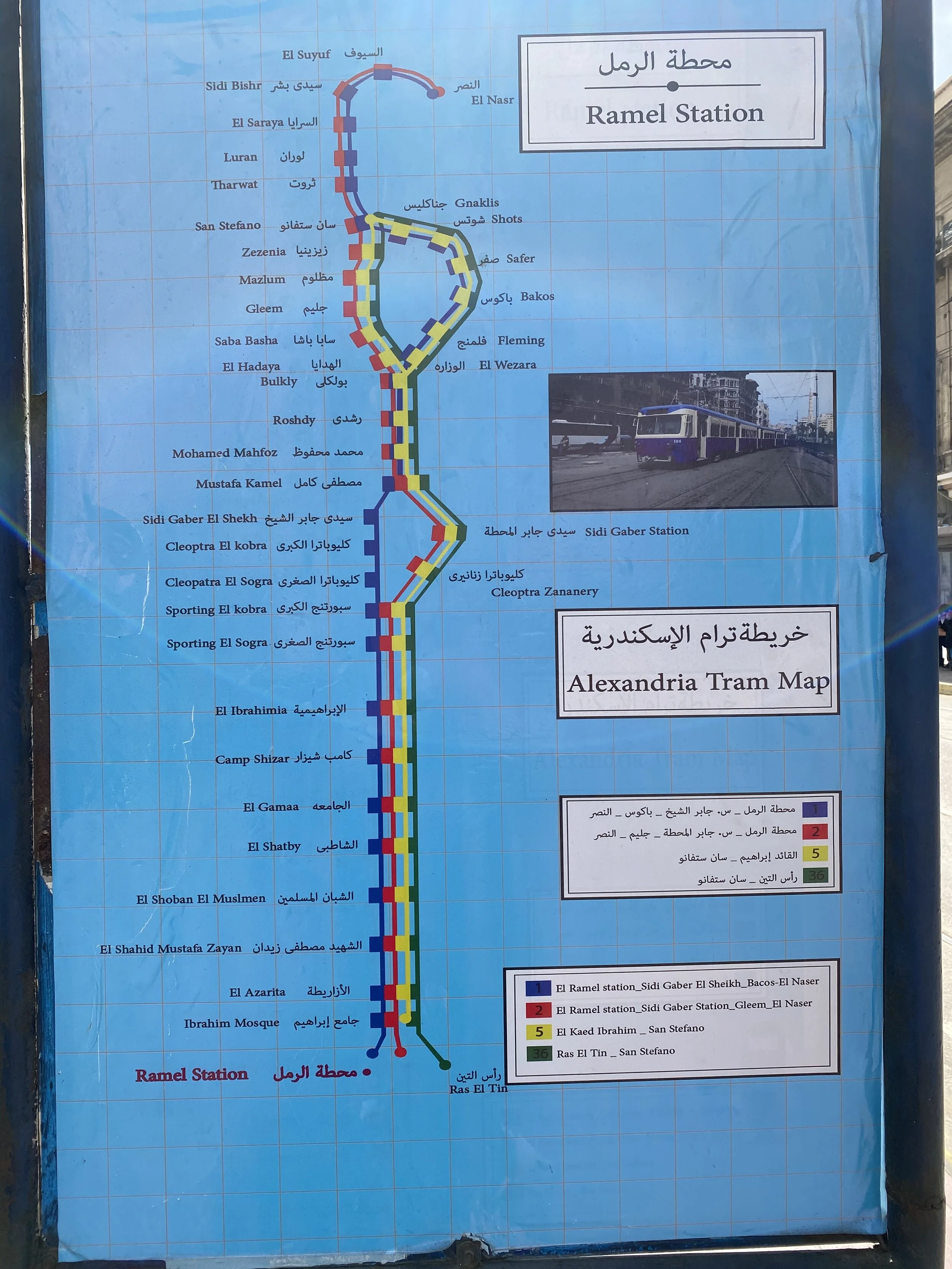 Here is a map of the tram lines in Alexandria, from Ramel Station (the center of downtown).